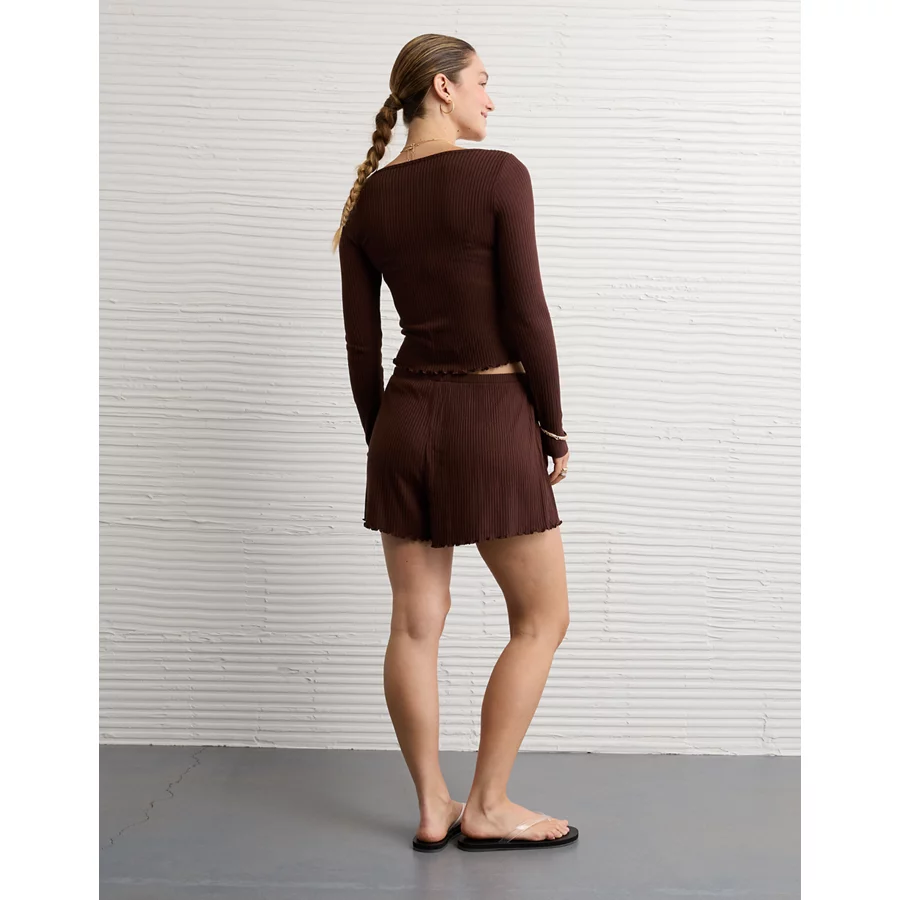 Cozy ribbed plush knit fabricationLong sleeve topScoop neckShorts with lace trim 95% Polyester, 5% ElastaneMachine washImported Relaxed fit