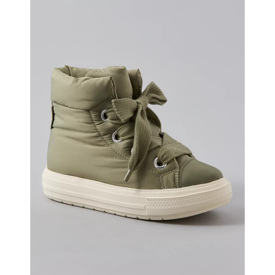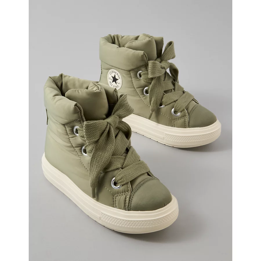 Mid-cut boot silhouette with a puffed-up lookWater-repellent, insulated polyester upper helps keep you warm and dryIconic Chuck Taylor ankle patch