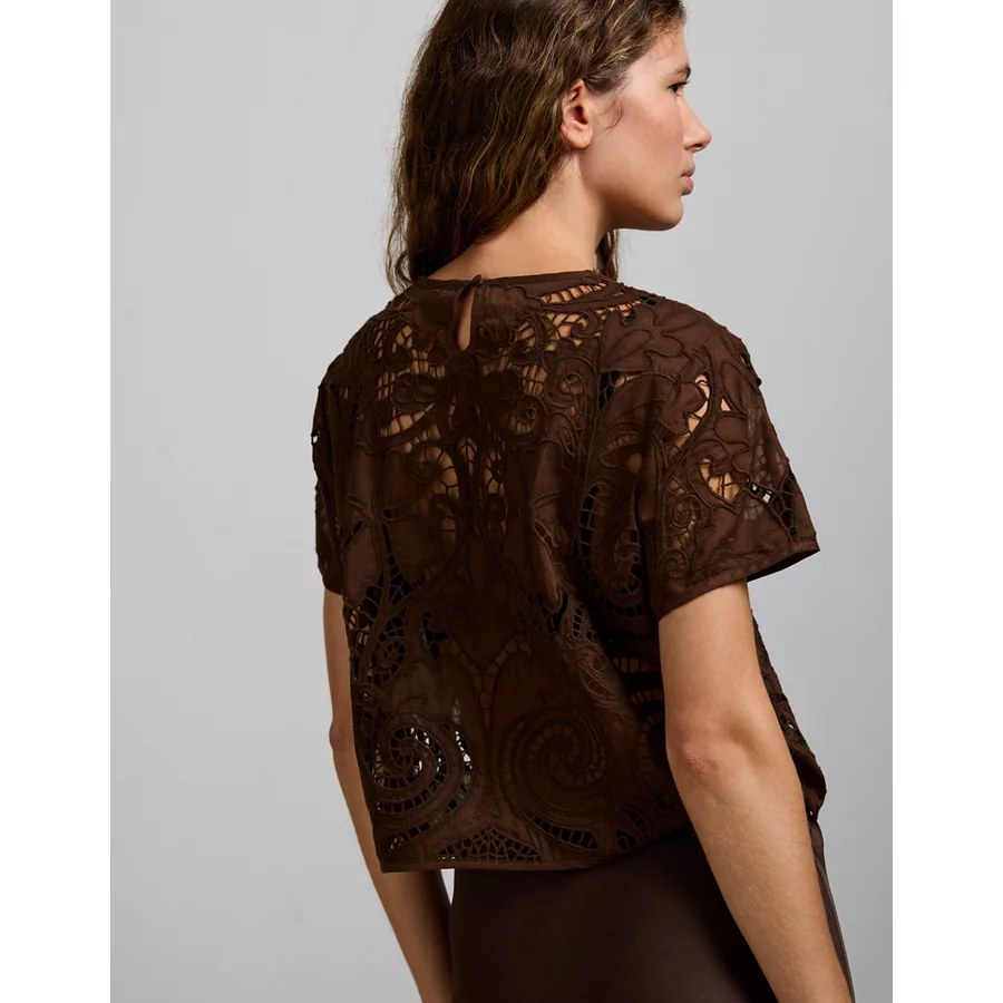 Cotton voile embroidered laceCrew neck 100% CottonDry cleanImported Relaxed fitCropped lengthShort sleeves