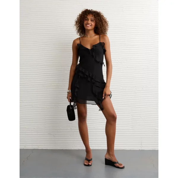 Adjustable spaghetti strapsSweetheart necklineAsymmetrical ruffle skirt 100% PolyesterMachine washImported SleevelessShift dress silhouetteMini length