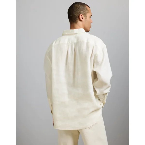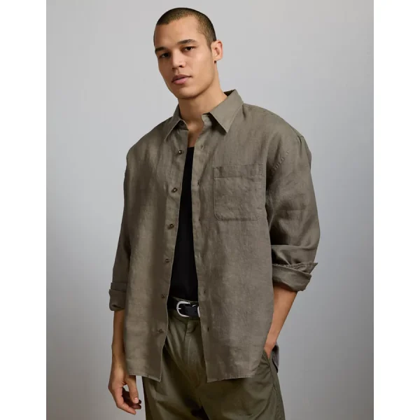 Lightweight summer linenDouble pleats at sleeve cuffChest patch pocketShirttail hem 100% LinenMachine washImported Oversized and relaxed throughoutLong sleeves