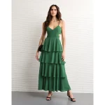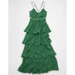 Chiffon fabricV-neckAsymmetrical ruffle details throughout 100% PolyesterMachine washImported Slip dress silhouetteMaxi lengthSleeveless