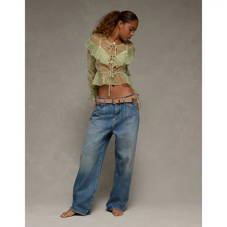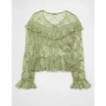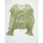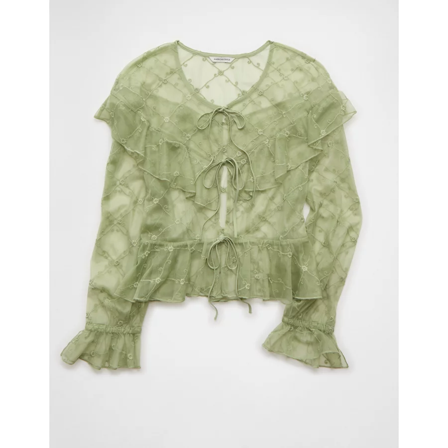 AE Embroidered Tie-Front Mesh Blouse – Green
