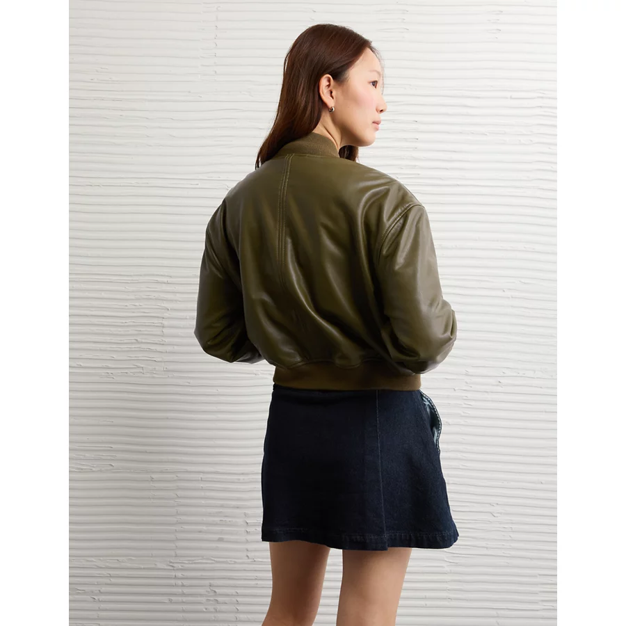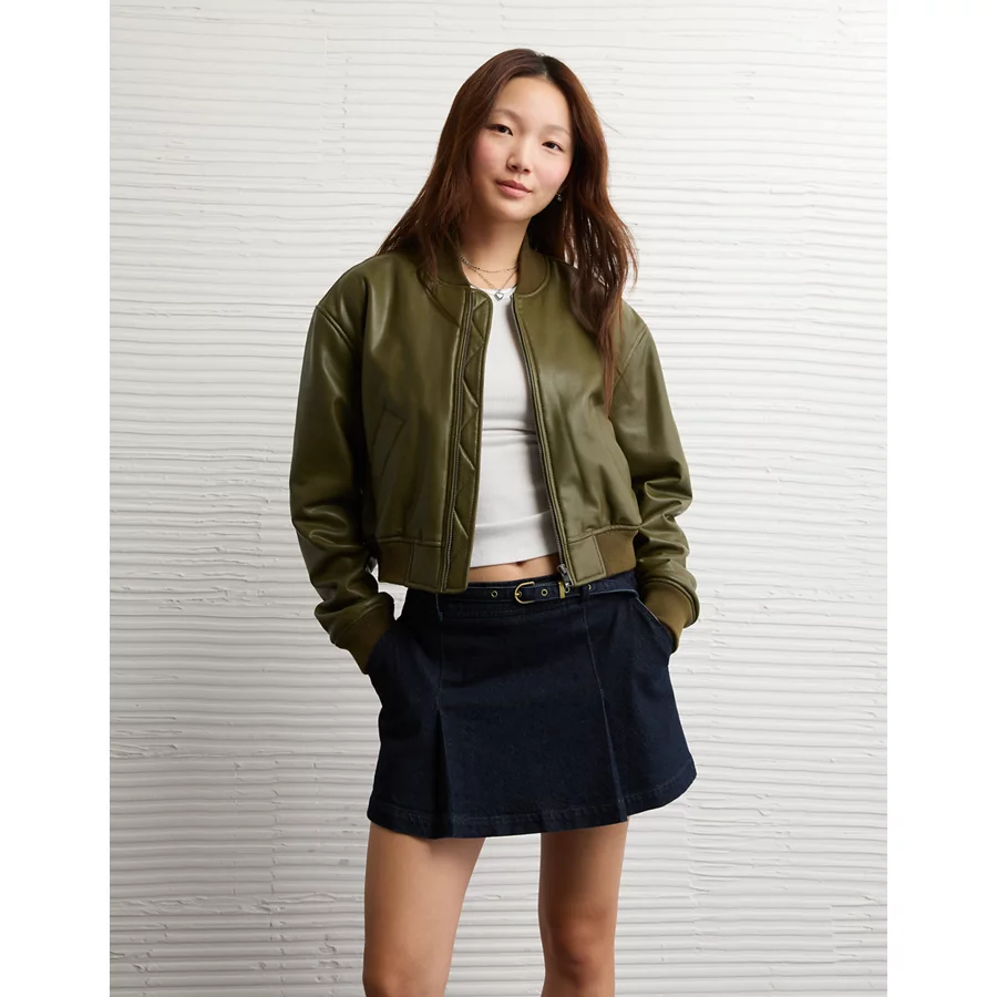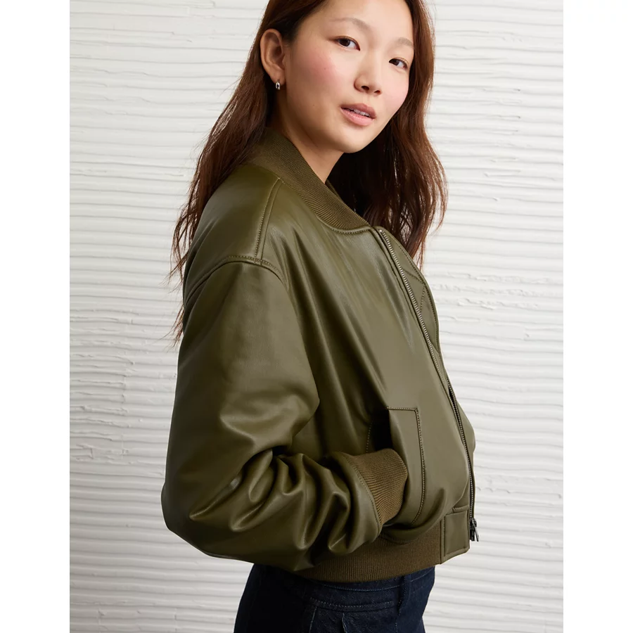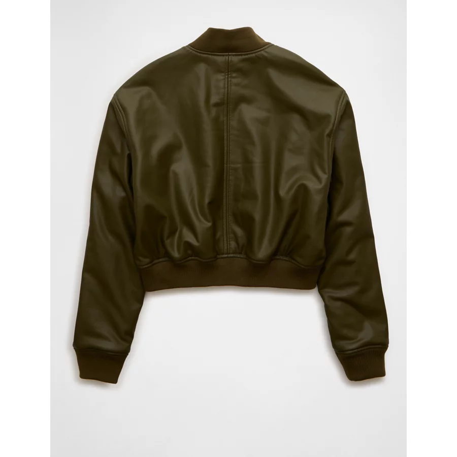 AE Faux Leather Cropped Bomber Jacket – Olive