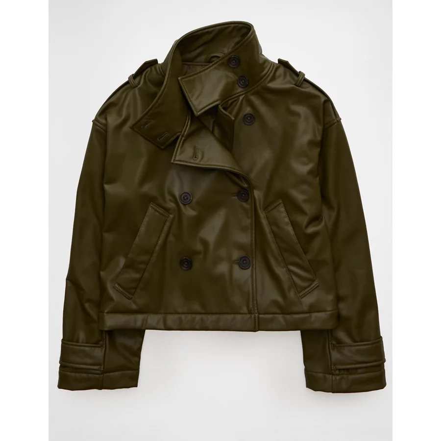 AE Faux Leather Cropped Bomber Jacket - Olive