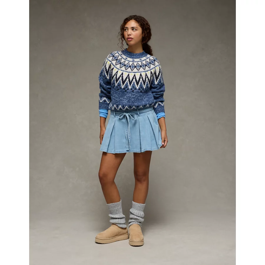 AE High-Waisted Pleated Mini Skirt – Light Wash