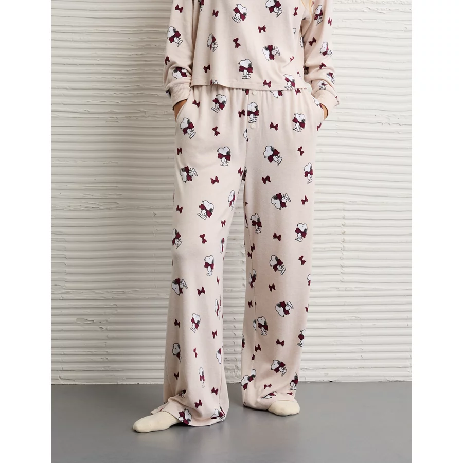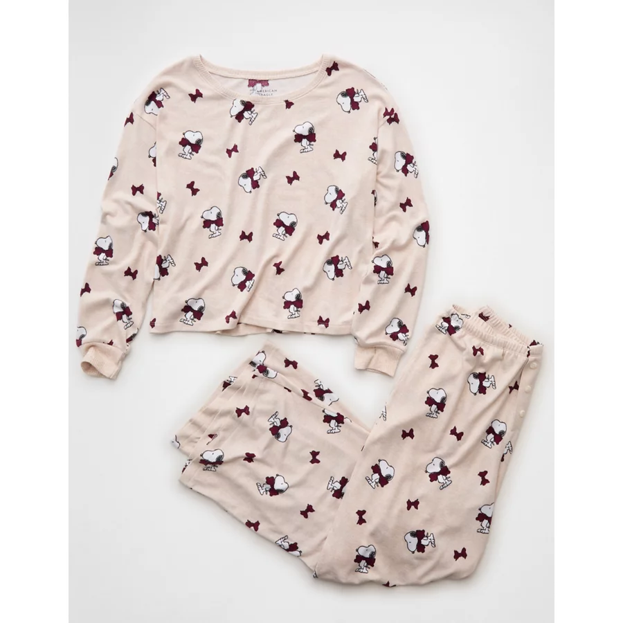 AE Luxe Plush Snoopy Long-Sleeve & Pant PJ Set – Oatmeal Heather