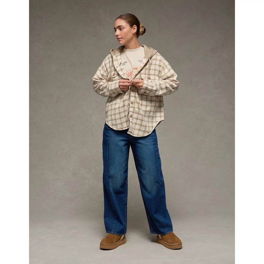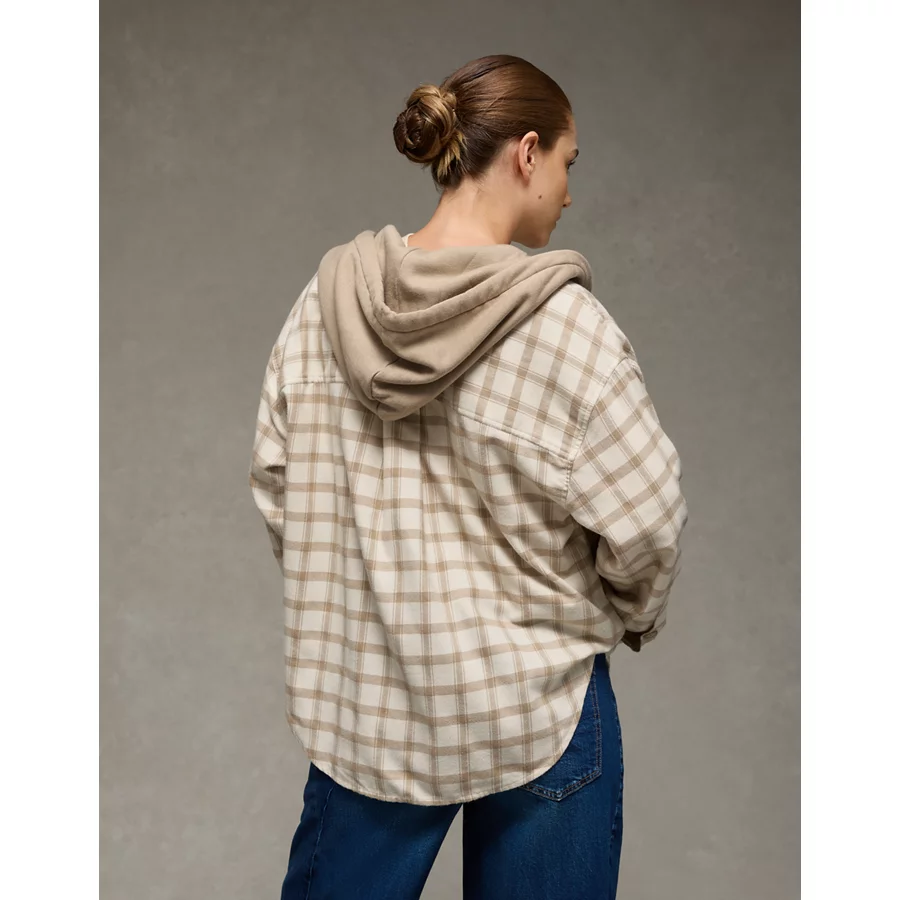 AE Plaid Hooded Button-Up Shirt – Cream