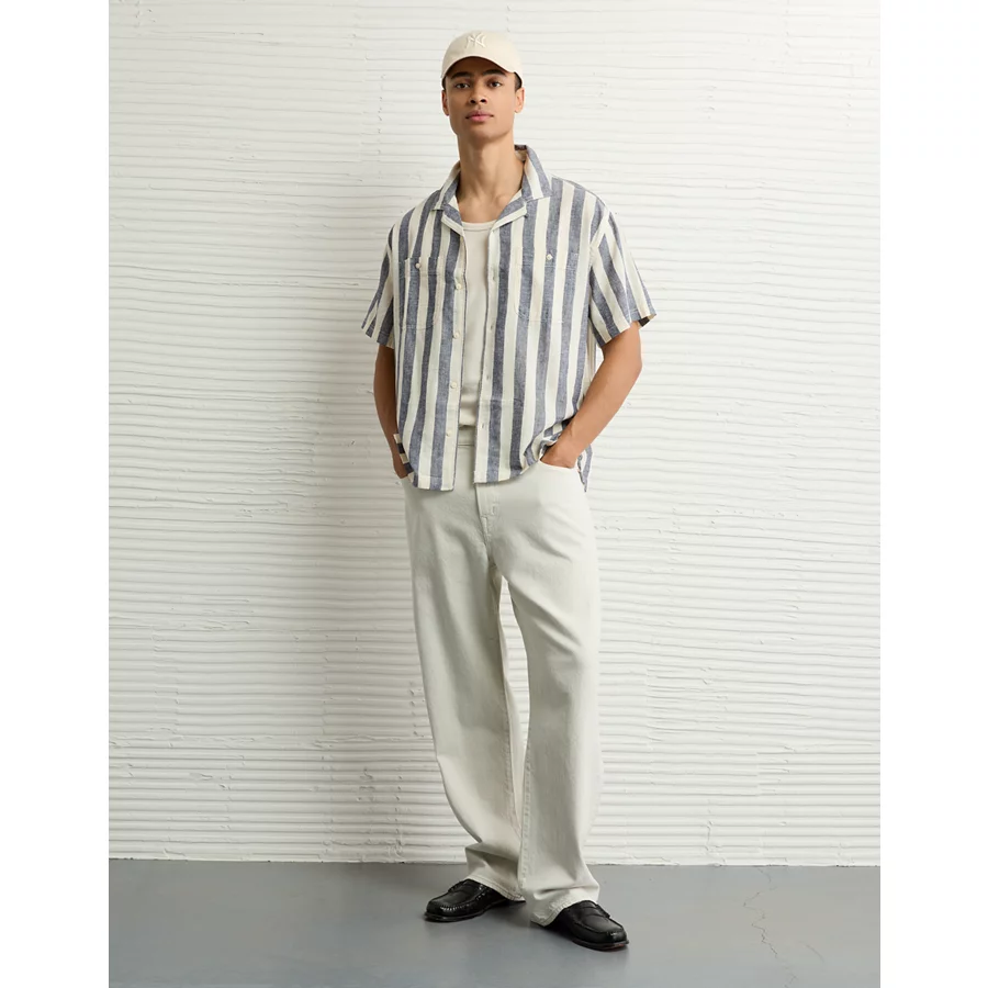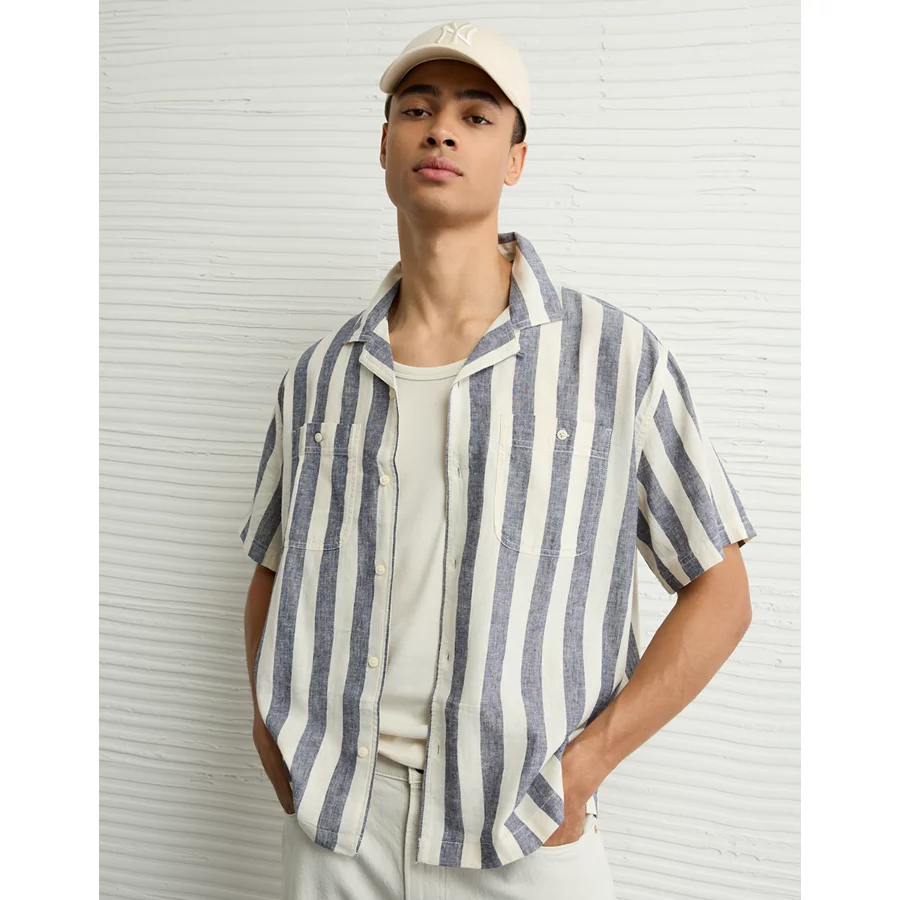 AE Poolside Linen-Blend Striped Button-Up Shirt - White