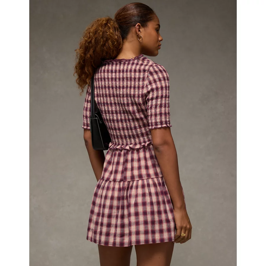 AE Puff Sleeve Tie Front Plaid Mini Dress – Burgundy