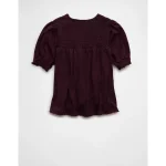 AE Sunchaser High Neck Puff Sleeve Smocked T-Shirt - Berry