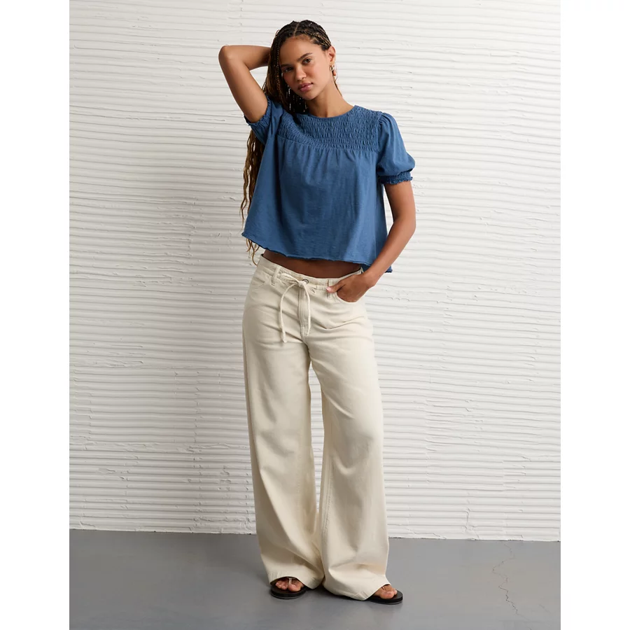 AE Sunchaser High Neck Puff Sleeve Smocked T-Shirt - Cream
