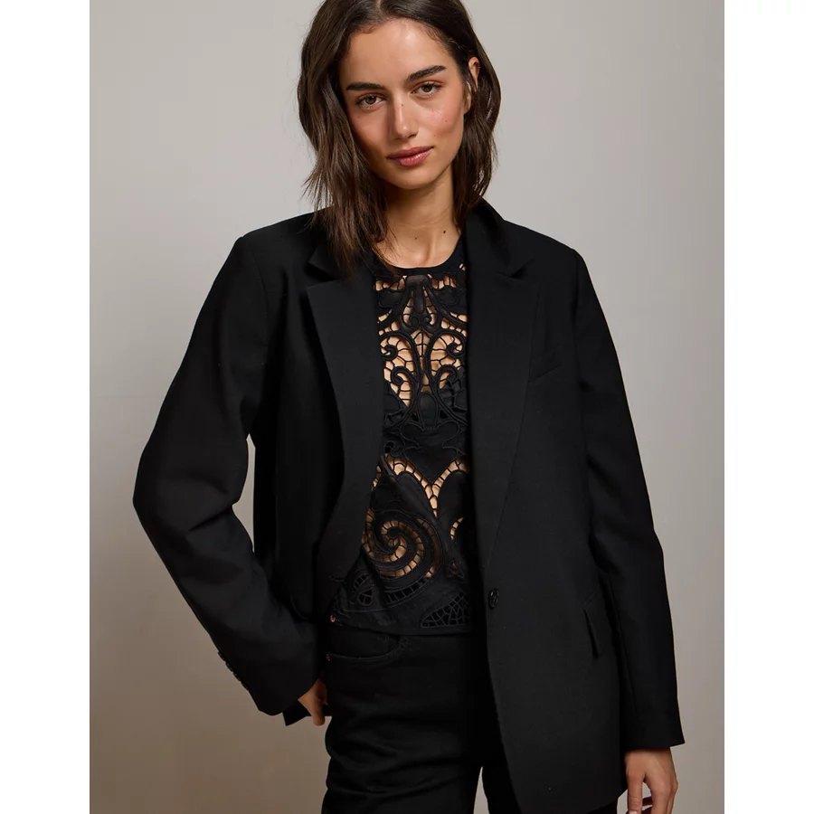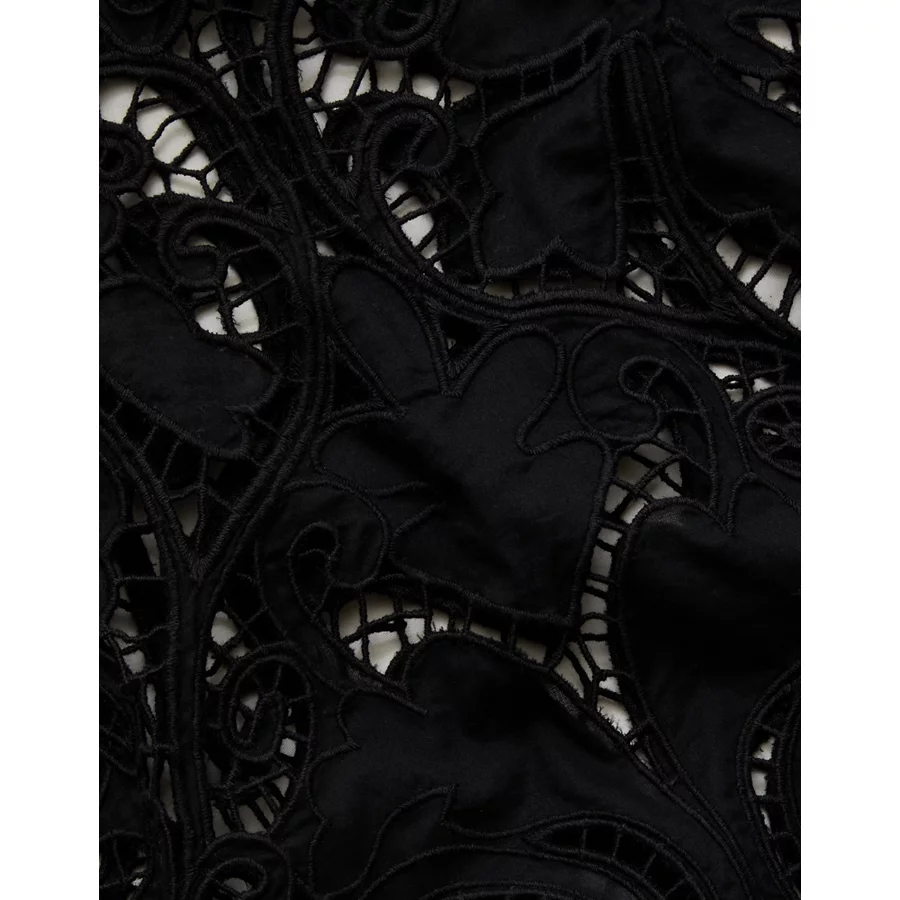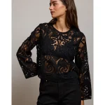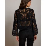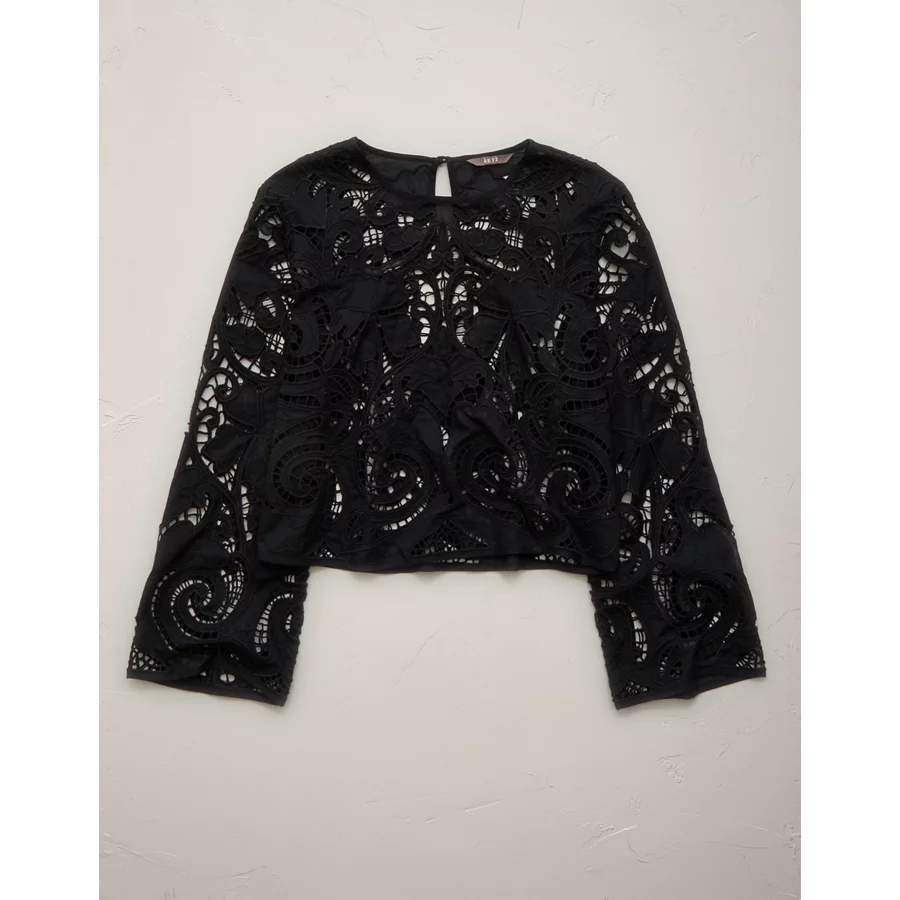 AE77 Cropped Long Sleeve Lace Top – Black