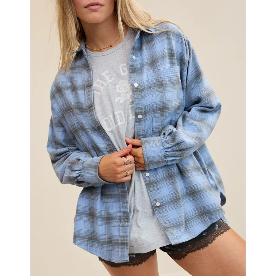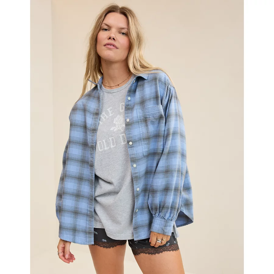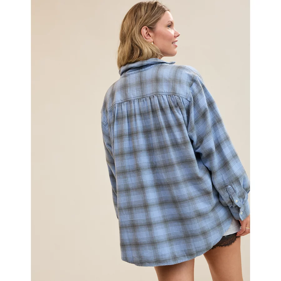 Soft, cozy flannel with a fun plaid printOversized chest pocket (for ALL your sunshine)Functional buttons 100% CottonMachine washImported Oversized and