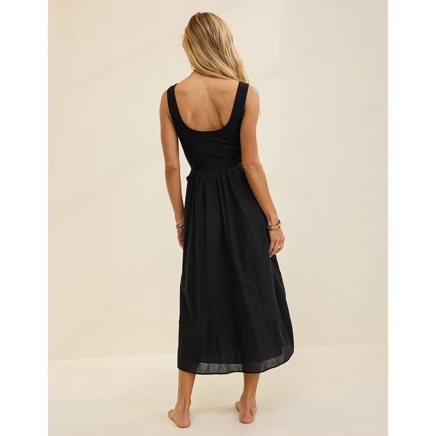 Mixed fabrics! Soft, stretchy knit bodice with a lightweight gauzey skirtScoop necklineSide seam pockets (!!)Accessibility deets: over-the-head access for easy