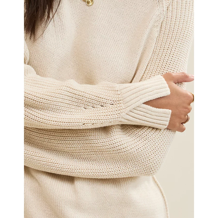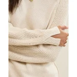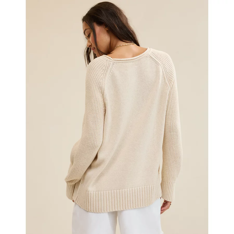 Real Good Everyday yarnRolled necklineRibbed trim on cuffs and hemPointelle deets and split cuffs on the sleevesThis style is heathered