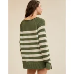 Real Good Everyday yarnRolled necklineRibbed trim on cuffs and hemPointelle deets and split cuffs on the sleevesStripedAccessibility deets: over-the-head access