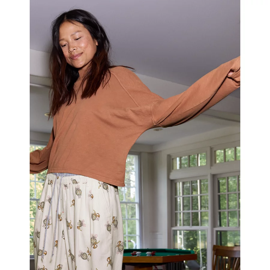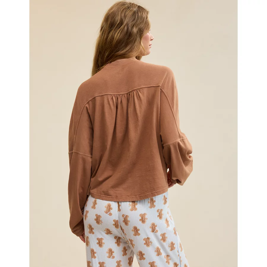 Real Good Everyday yarnRolled necklineRibbed trim on cuffs and hemPointelle deets and split cuffs on the sleevesThis style is heathered