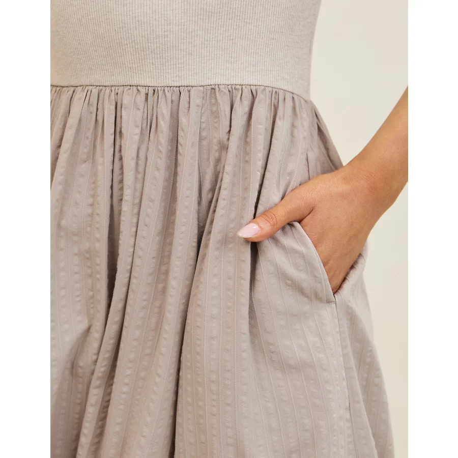 Mixed fabrics! Soft, stretchy knit bodice with a lightweight gauzey skirtScoop necklineSide seam pockets (!!)Accessibility deets: over-the-head access for easy