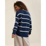 Real Good Everyday yarnRolled necklineRibbed trim on cuffs and hemPointelle deets and split cuffs on the sleevesStripedAccessibility deets: over-the-head access
