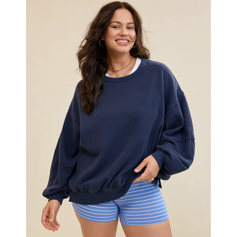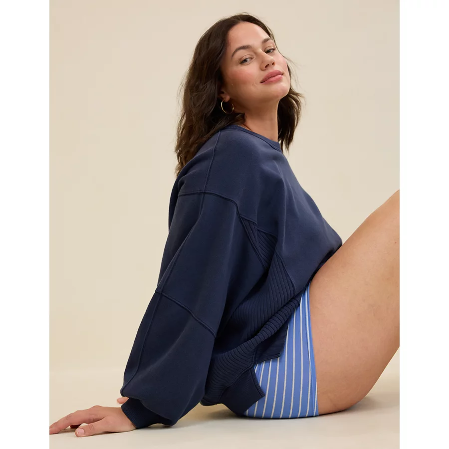 Real Good Everyday yarnRolled necklineRibbed trim on cuffs and hemPointelle deets and split cuffs on the sleevesStripedAccessibility deets: over-the-head access