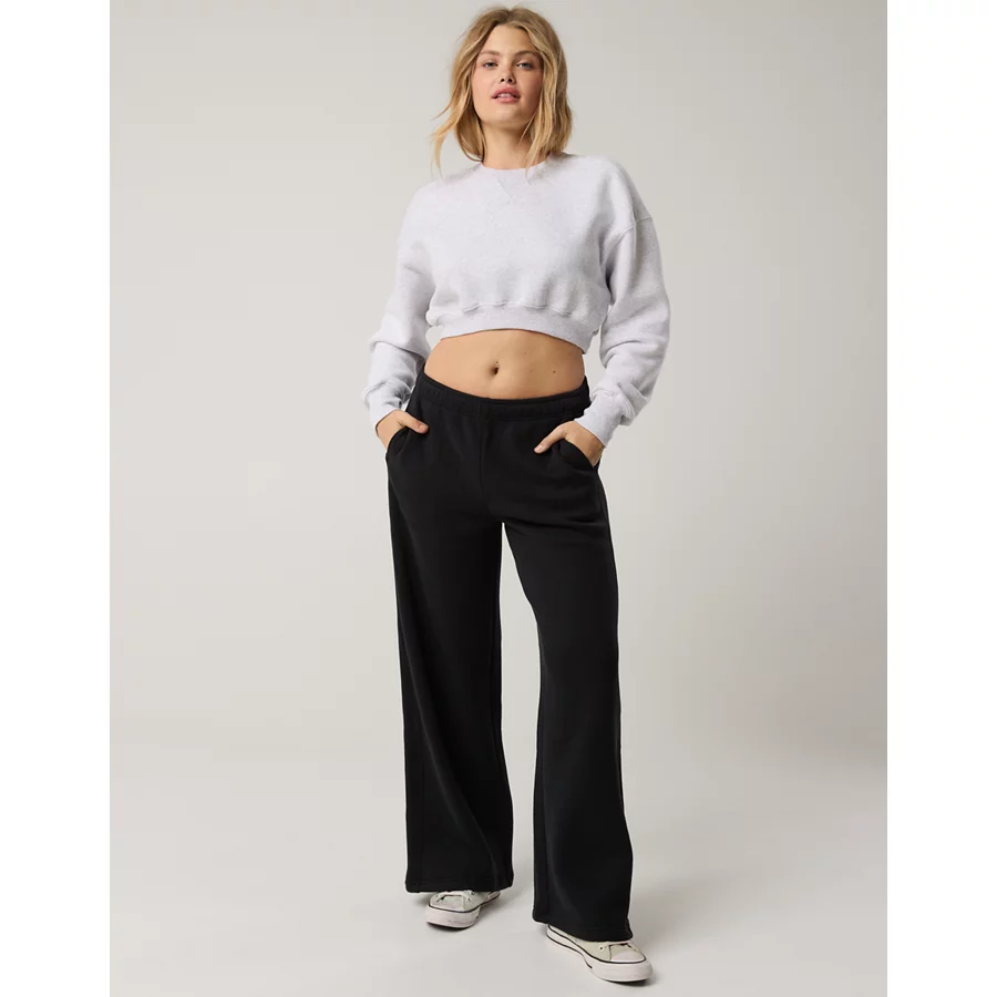 THE FIT: Regular rise with optional foldover waistband. Wide Leg – 11 leg opening.