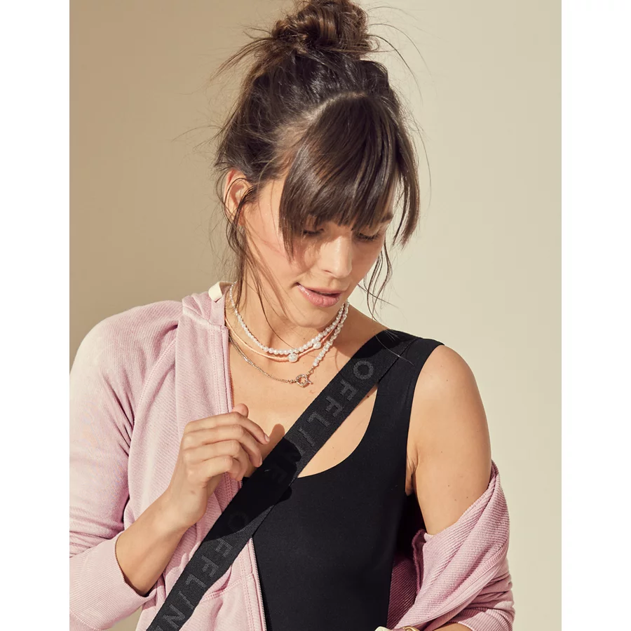 THE FEEL: Like a cloud. 3 mesh interior pockets for water bottles, clothes, you name it. 1 zipper interior pocket (fits all the essentials!). Adjustable strap with logo.