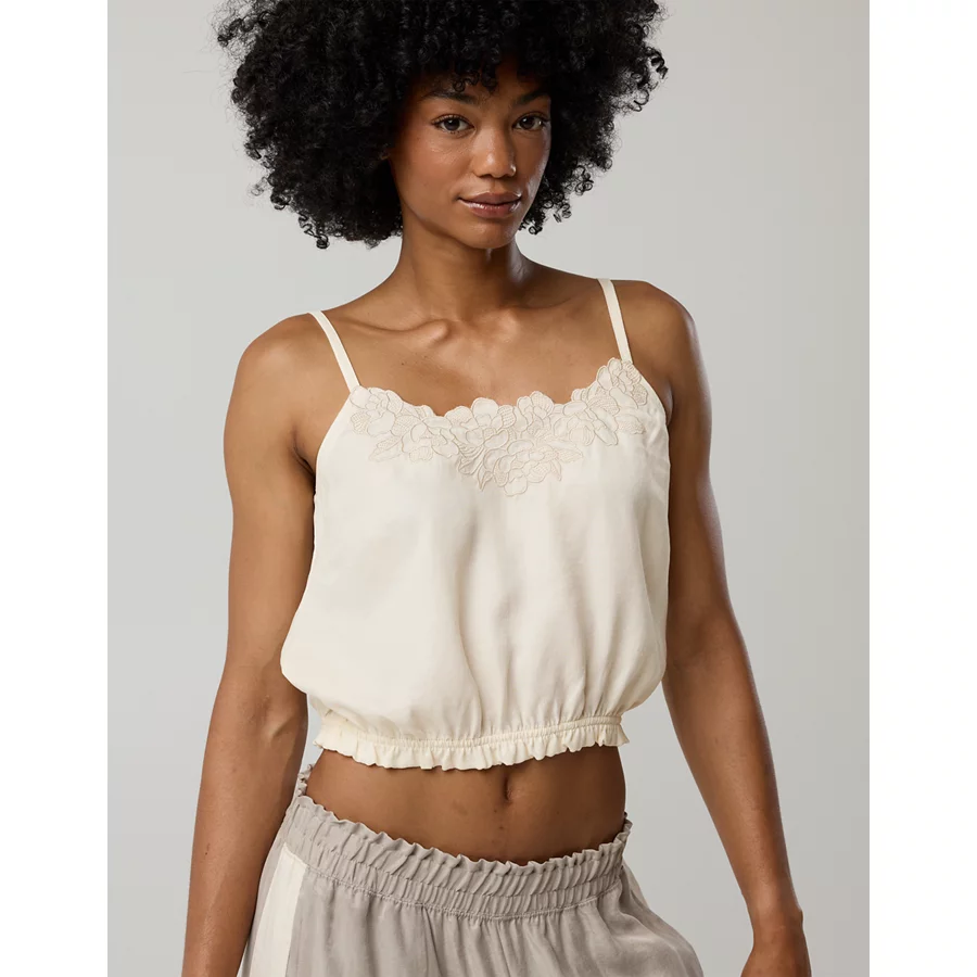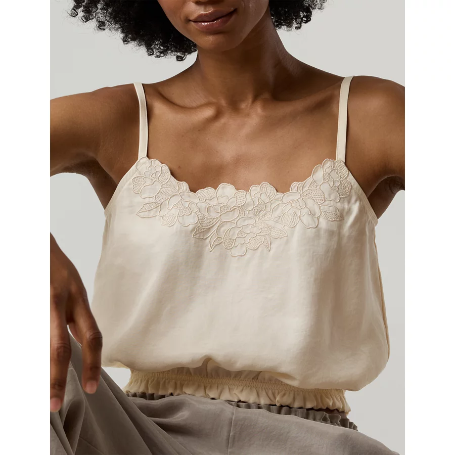 THE LOOK: Smooth with subtle shine. Embroidery detailing. Elastic bottom hem.