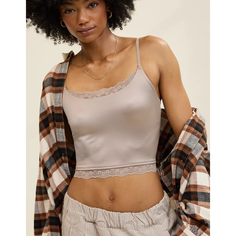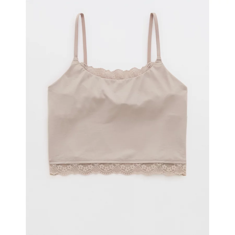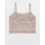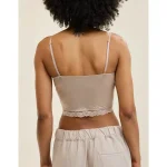 Design: Lace trim along neckline and bottom hem. Crop length hits at waist.
